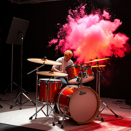 Once a year, every student gets the chance to take part in a professional drum photo shoot. These sessions are designed to create amazing, high-quality images that students and families can keep forever. Whether it’s a bold colored chalk shoot, dramatic smoke effects, or a clean setup with sticks and drum kit pieces arranged for a striking look, each session is built to make students look confident, creative, and proud of their progress.